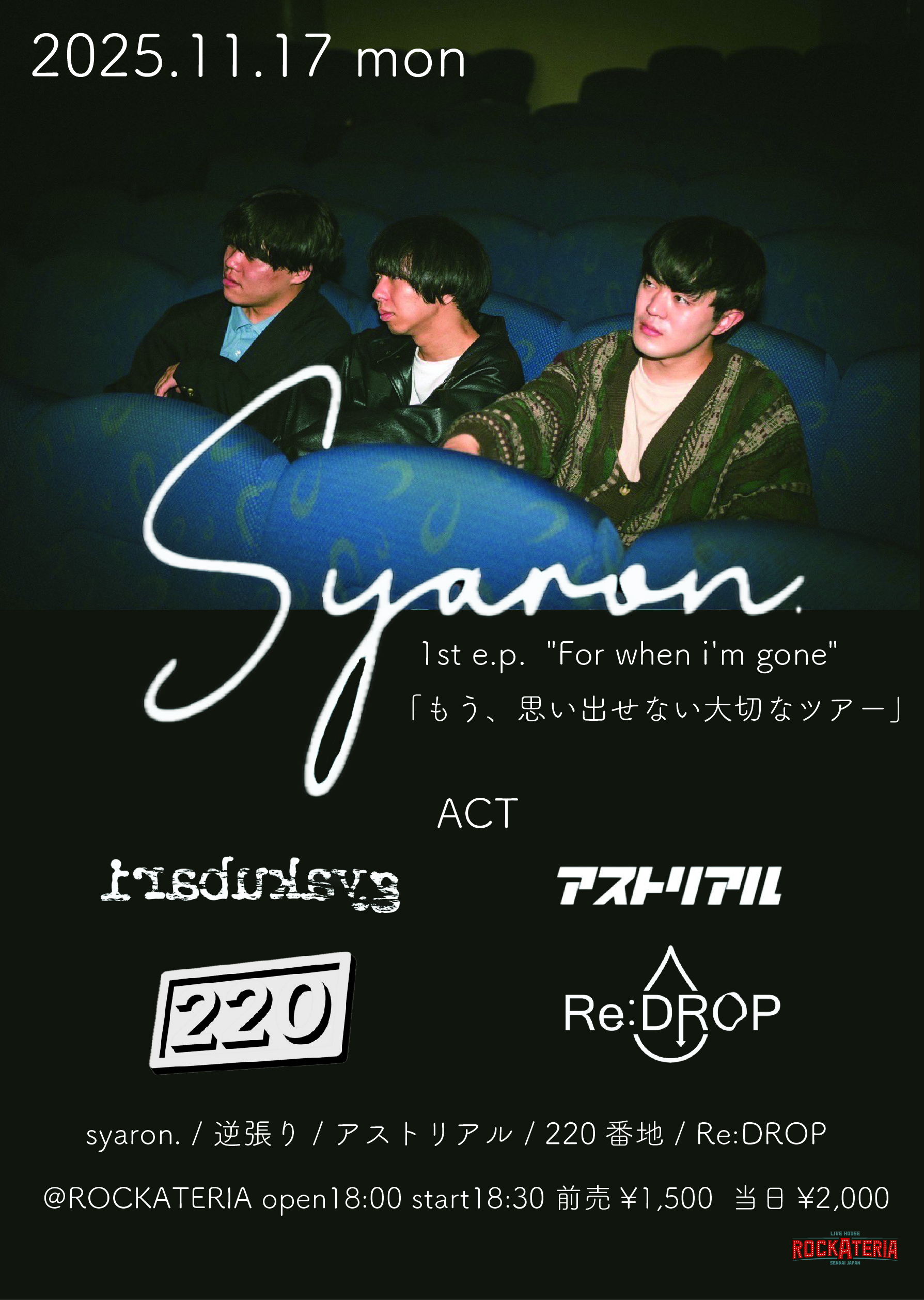 ACT Syaron. / 逆張り / 220番地 / アストリアル / Re:DROP OPEN 18:00 START 18:30 TICKET 前売¥1,500 当日¥2,000 ※入場時ドリンク代別¥600 PLAYGUIDE INFORMATION ROCKATERIA 022-748-7697