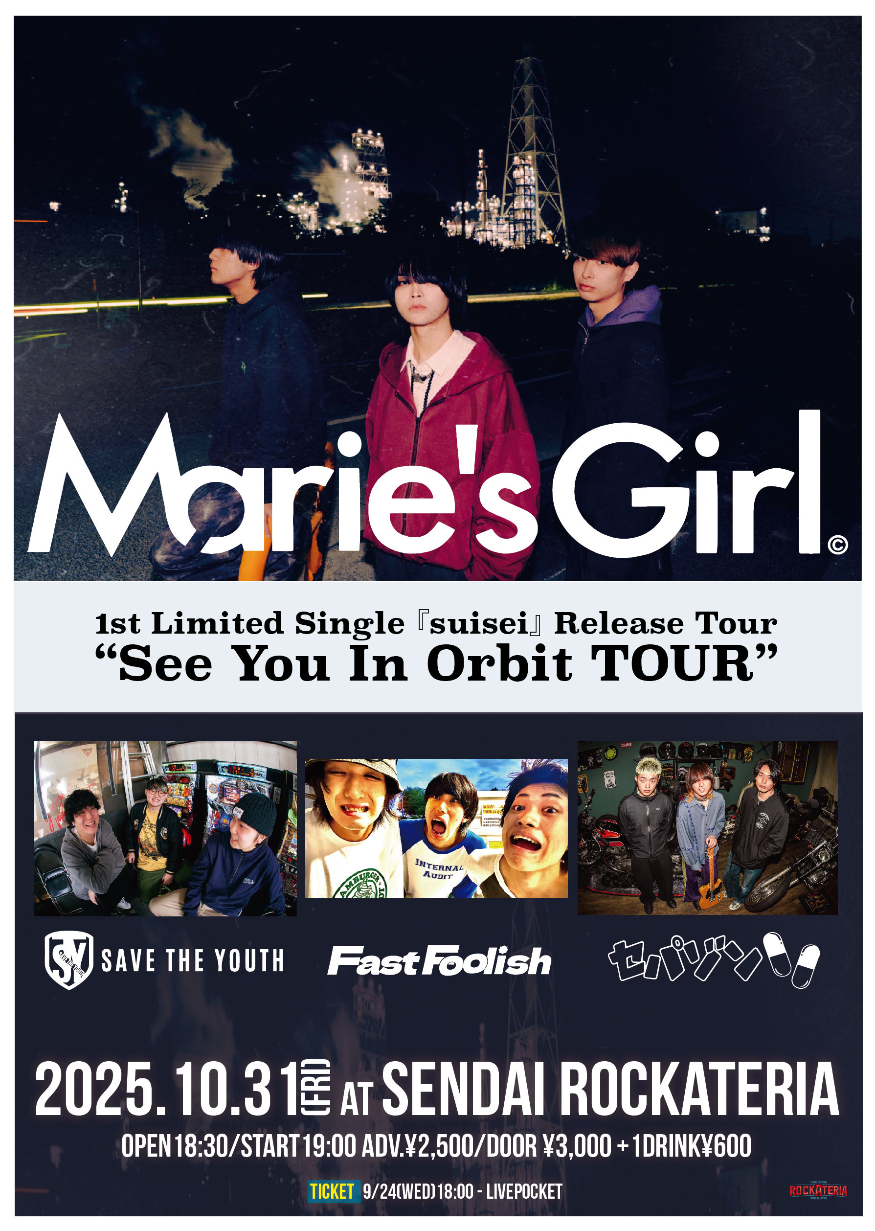 ACT Marie's Girl / Fast Foolish / SAVE THE YOUTH / セパゾン OPEN 18:30 START 19:00 TICKET 前売¥2,500 当日¥3,000 ※入場時ドリンク代別¥600 PLAYGUIDE 一般発売 [2025/09/24(日) 18:00] 発売 LivePocket INFORMATION ROCKATERIA 022-748-7697