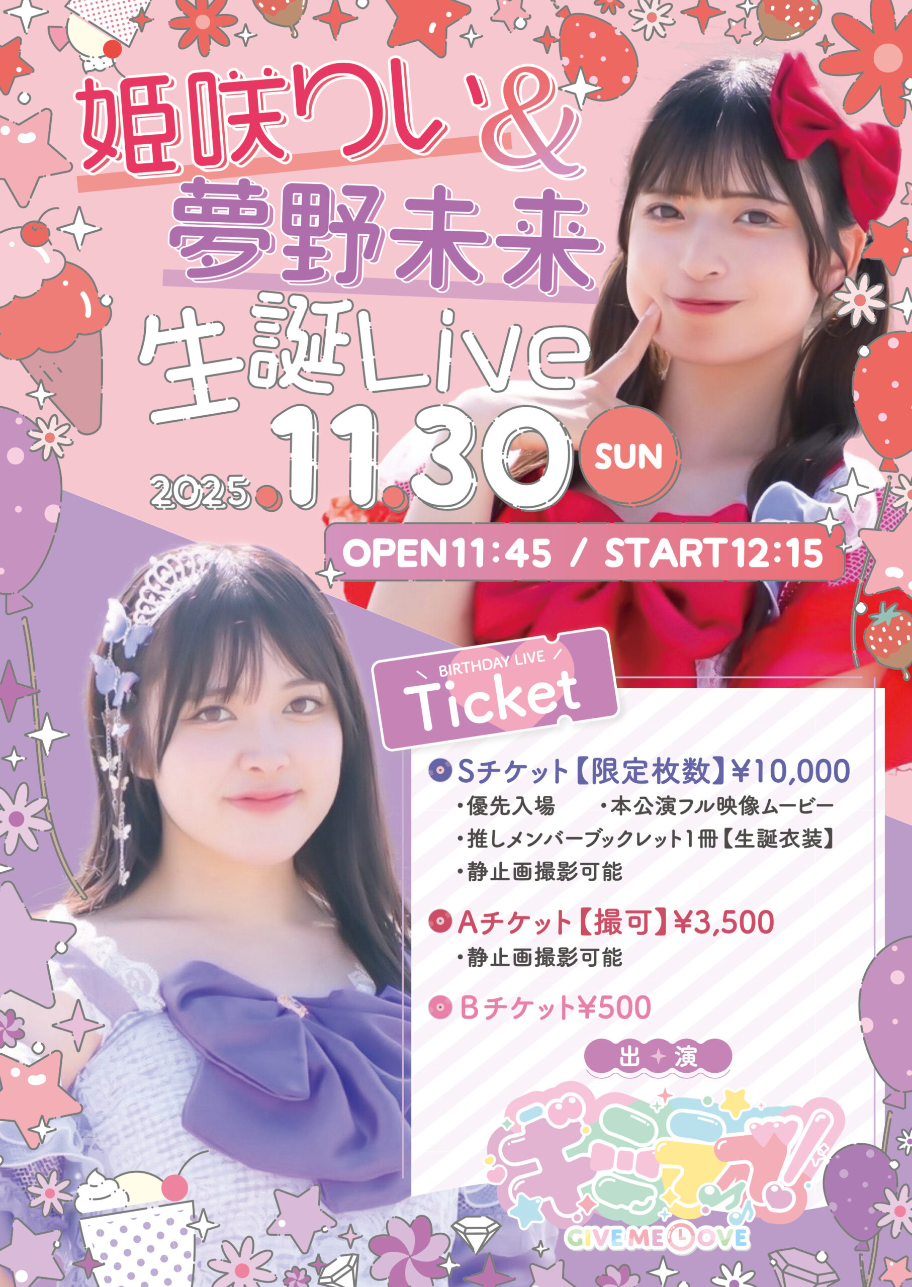 ACT 姫咲りい&夢野未来 OPEN 11:45 START 12:15 TICKET Aチケット【撮可】¥3,500 ・静止画撮影可能 Bチケット¥500 ※入場時ドリンク代別¥600 PLAYGUIDE 発売中! https://tiget.net/events/429330 INFORMATION ROCKATERIA 022-748-7697