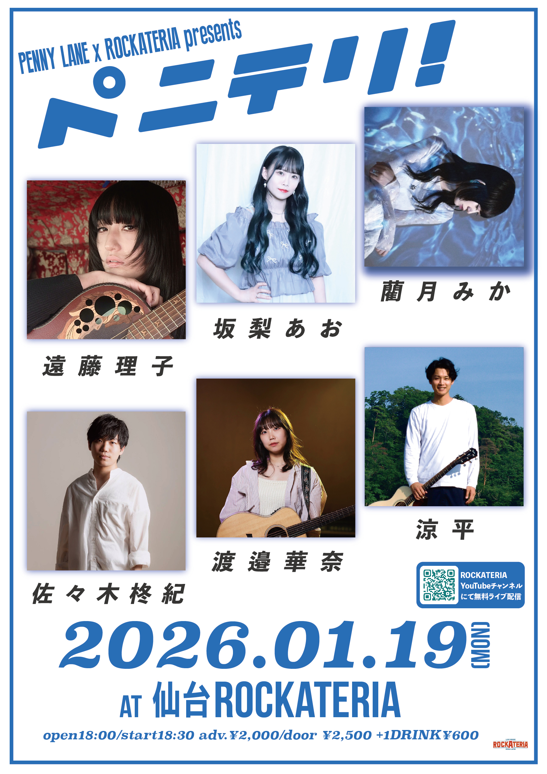 ACT 藺月みか / 渡邉華奈 / 坂梨あお / 佐々木柊紀 / 遠藤理子 / 涼平 OPEN 18:00 START 18:30 TICKET 前売¥2,000 当日¥2,500 ※入場時ドリンク代別¥600 PLAYGUIDE INFORMATION YouTubeライブ配信あり 応援チケット・ドリンク差し入れはコチラ ROCKATERIA 022-748-7697