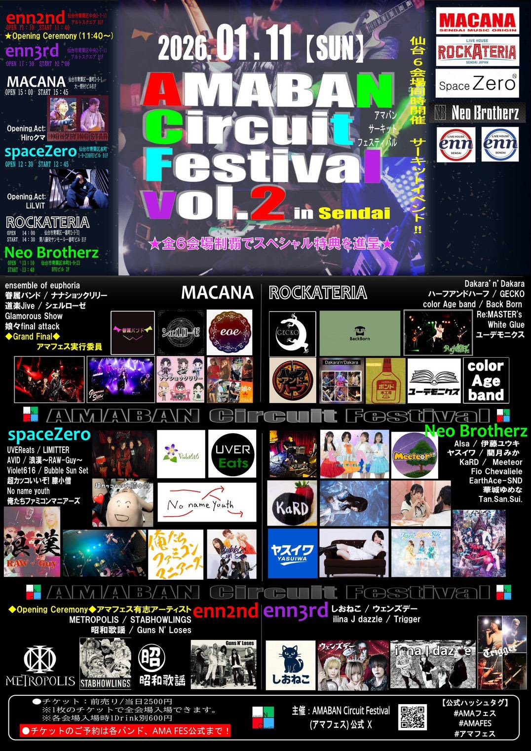 ACT Dakara'n'Dakara / White Glue / color Age band / GECKO / ハーフアンドハーフ / Re:MASTER's / ユーデモニクス OPEN 13:45 START 14:15 TICKET 前売 / 当日¥2,500 全会場入場できます。 ※入場時ドリンク代別¥600 PLAYGUIDE AMABAN CIRCUIT FESTIVAL(公式) 出演者にドリンク差し入れ INFORMATION ROCKATERIA 022-748-7697