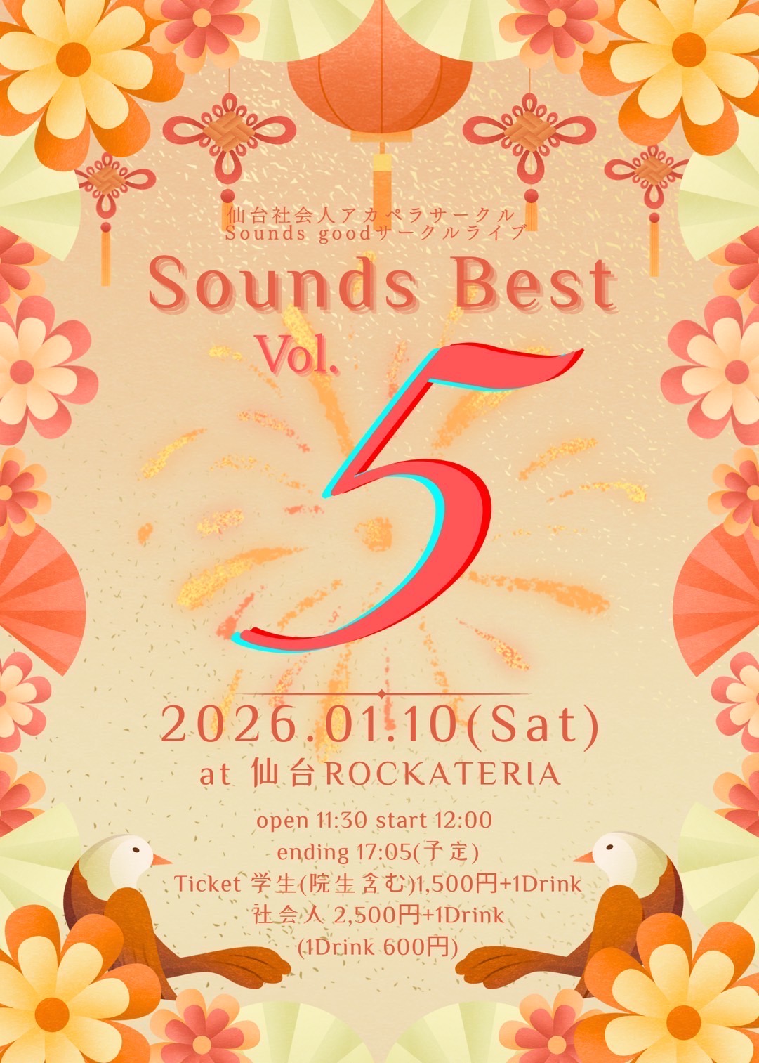 仙台社会人アカペラサークルSound goodサークルライブ ACT OPEN 11:30 START 12:00 TICKET 学生(院生含む)¥1,500 社会人¥2,500 ※入場時ドリンク代別¥600 PLAYGUIDE INFORMATION ROCKATERIA 022-748-7697