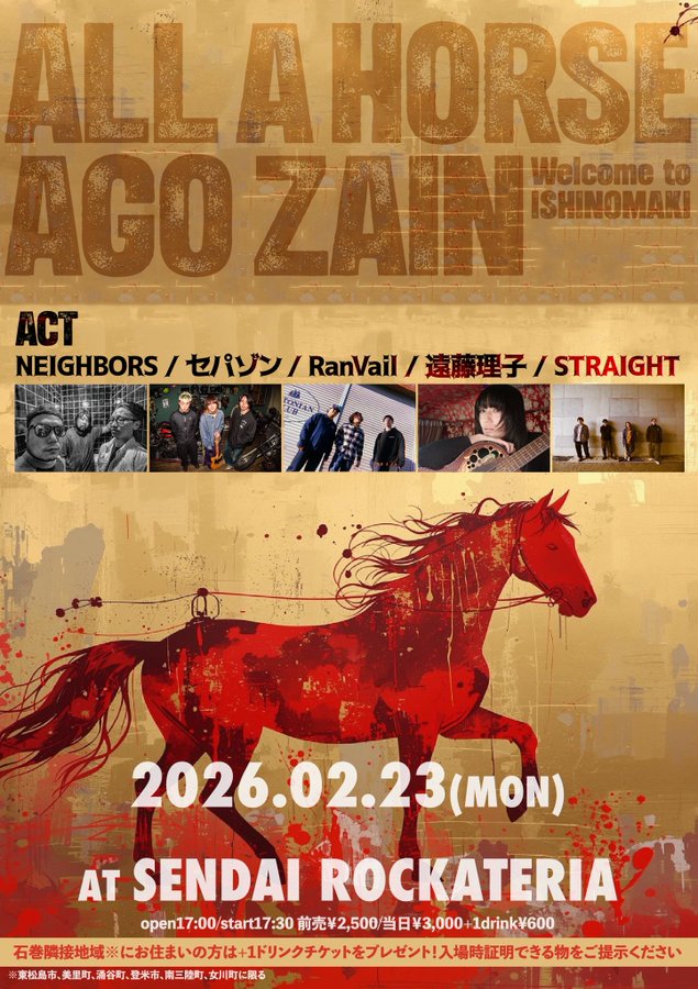 2/23 Mon ALL A HORSE AGO ZAIN-Welcome to ISHINOMAKI- ACT NEIGHBORS / セパゾン / RanVail / 遠藤理子 / STRAIGHT